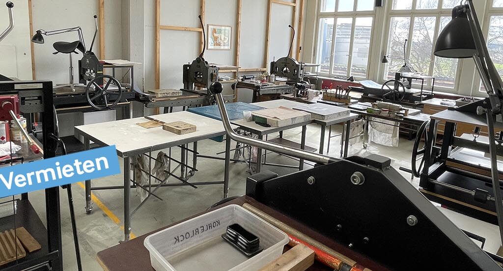 Wir vermieten unser Steindruckatelier. 83 m2, lichtdurchflutet. Es ist voll ausgerüstet mit unterschiedlich grossen Druckpressen, Tischen, Schleiftrog mit Sand-/Wassersystem, Lithosteinen, Walzen, Sand, Chemie,…