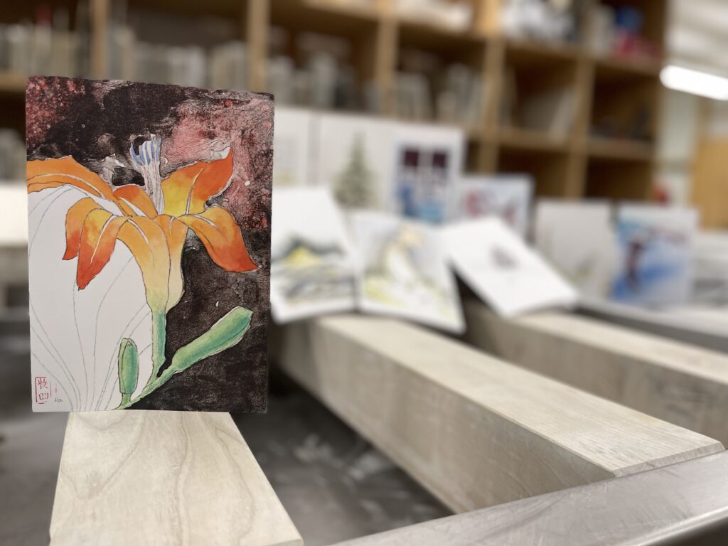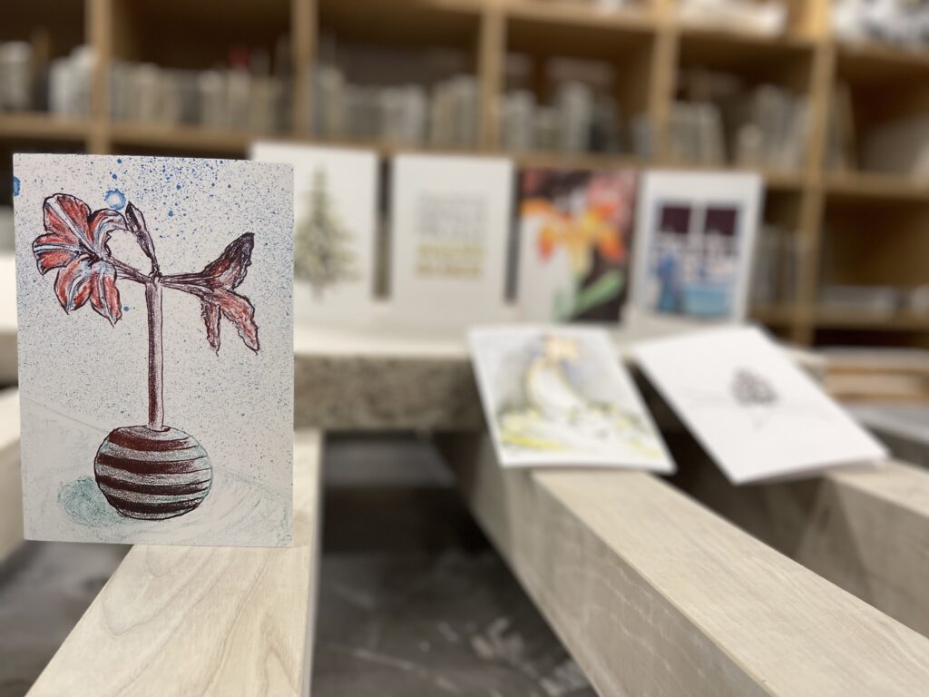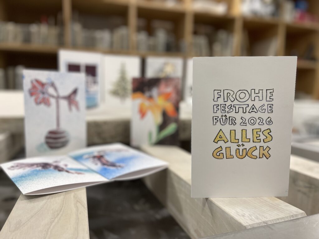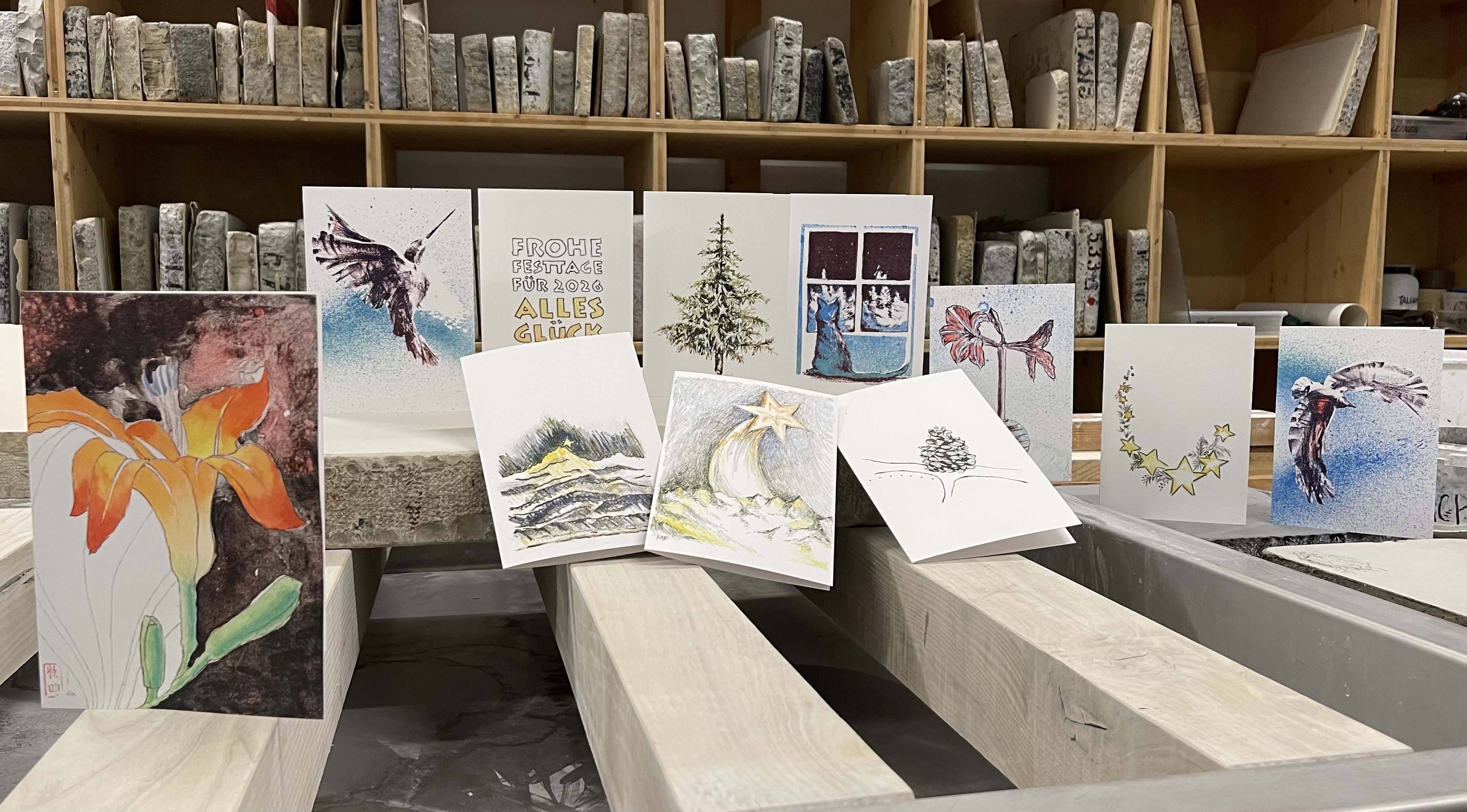 Die Gruppe «Lerne Steindruck» lies sich auf ihr erstes Projekt ein. Neun Künstlerinnen und Künstler zeichneten seitenverkehrt ihre Sujets für Weihnachts- und Neujahrskarten auf zwei Lithosteine. Ernst Hanke und Willy Etter brachten die Idee ein und leiteten künstlerisch, wie technisch das Projekt.